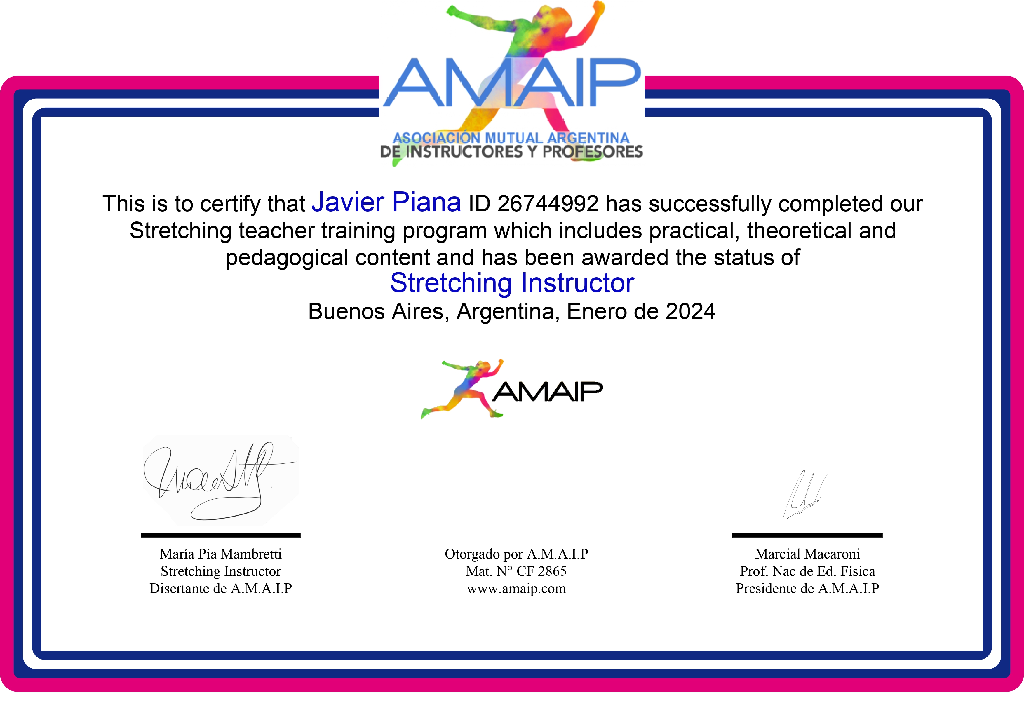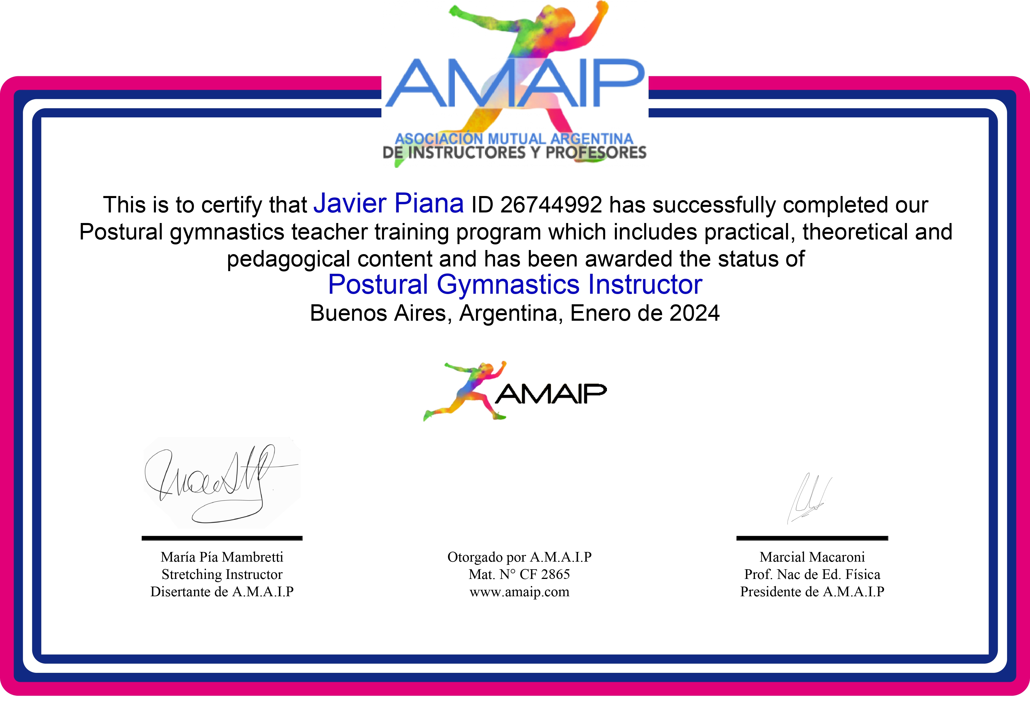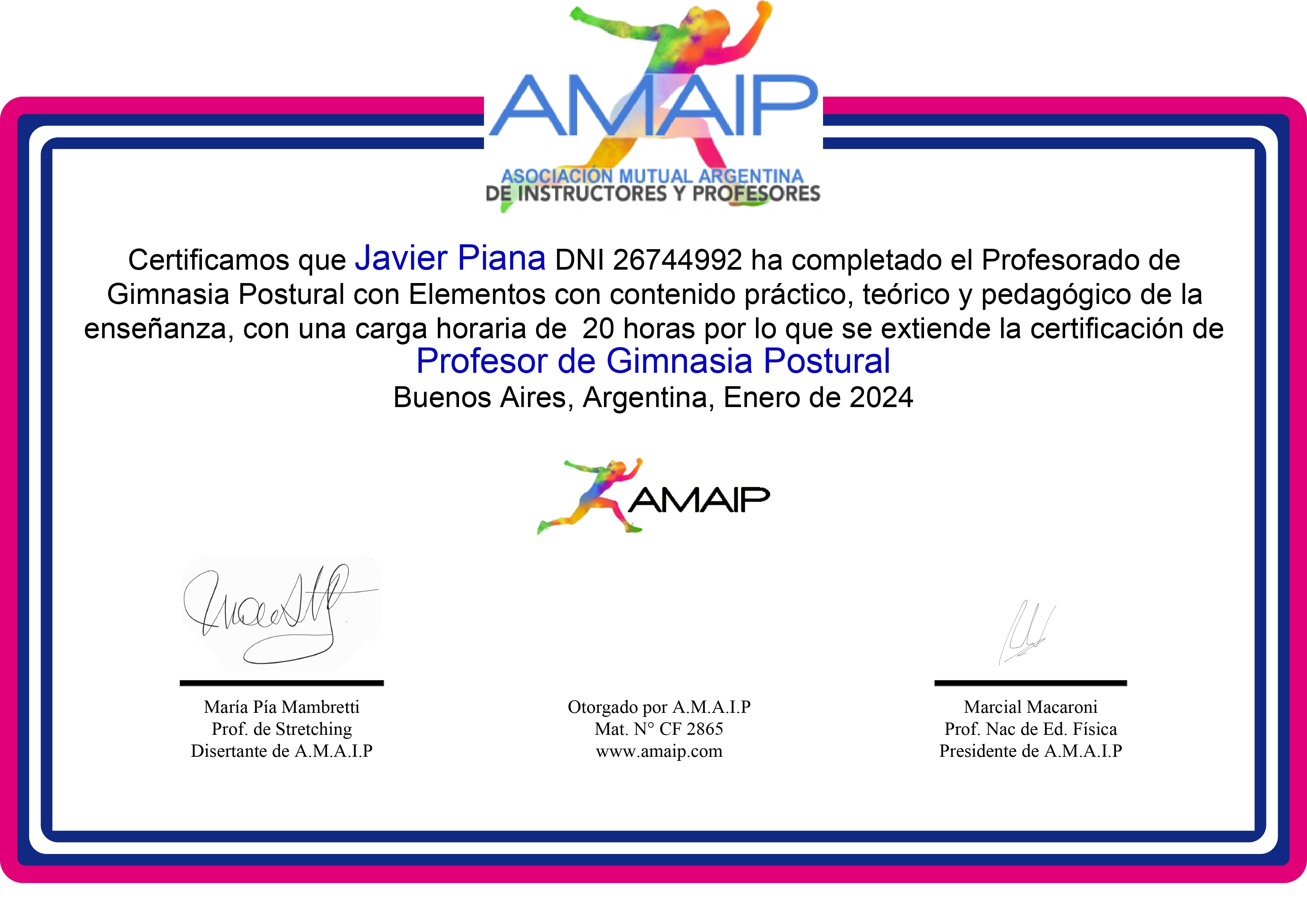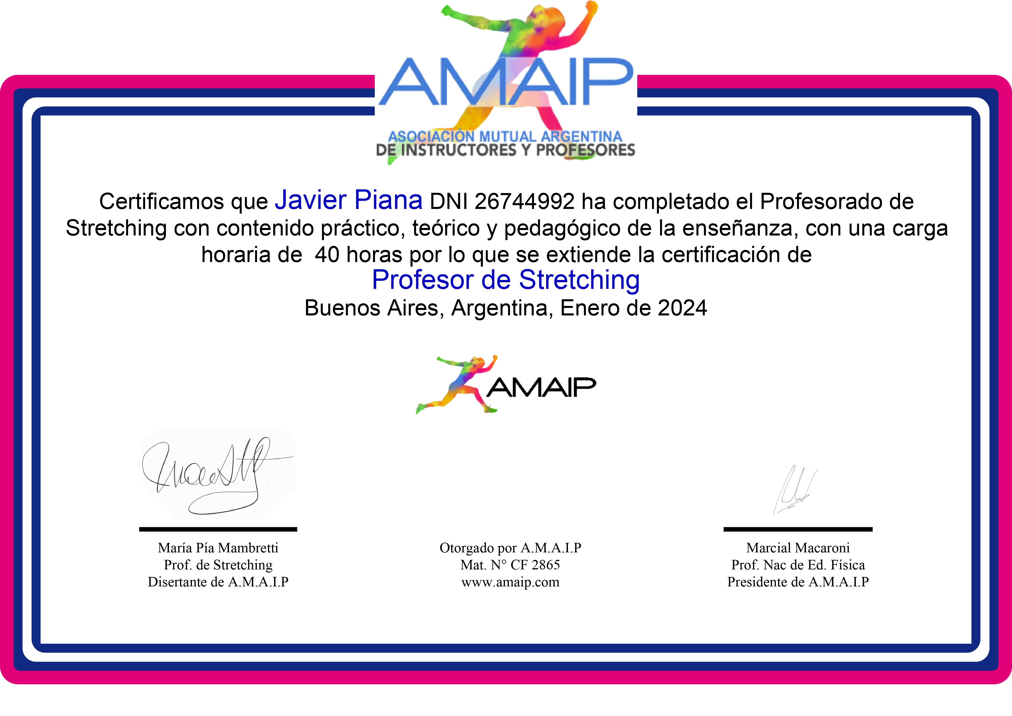 • Te damos la bienvenida a una oportunidad única de formación profesional: contarás con el contenido más completo sobre el entrenamiento de la FLEXIBILIDAD, con 4 módulos extra, especializados en GIMNASIA POSTURAL. • Con dos certificaciones, estarás apto para trabajar con atletas de alto rendimiento deportivo, y podrás planificar tus propias sesiones, para cualquier nivel de entrenamiento • Dictado por la profesora María Pía Mambretti, especialista en el entrenamiento de la flexibilidad y el método Stretching, disertante AMAIP. • Te invitamos a ver el siguiente VIDEO EXPLICATIVO, donde podrás observar todos los detalles acerca del profesorado, y luego a seguir leyendo el temario. • Bienvenidos a AMAIP.