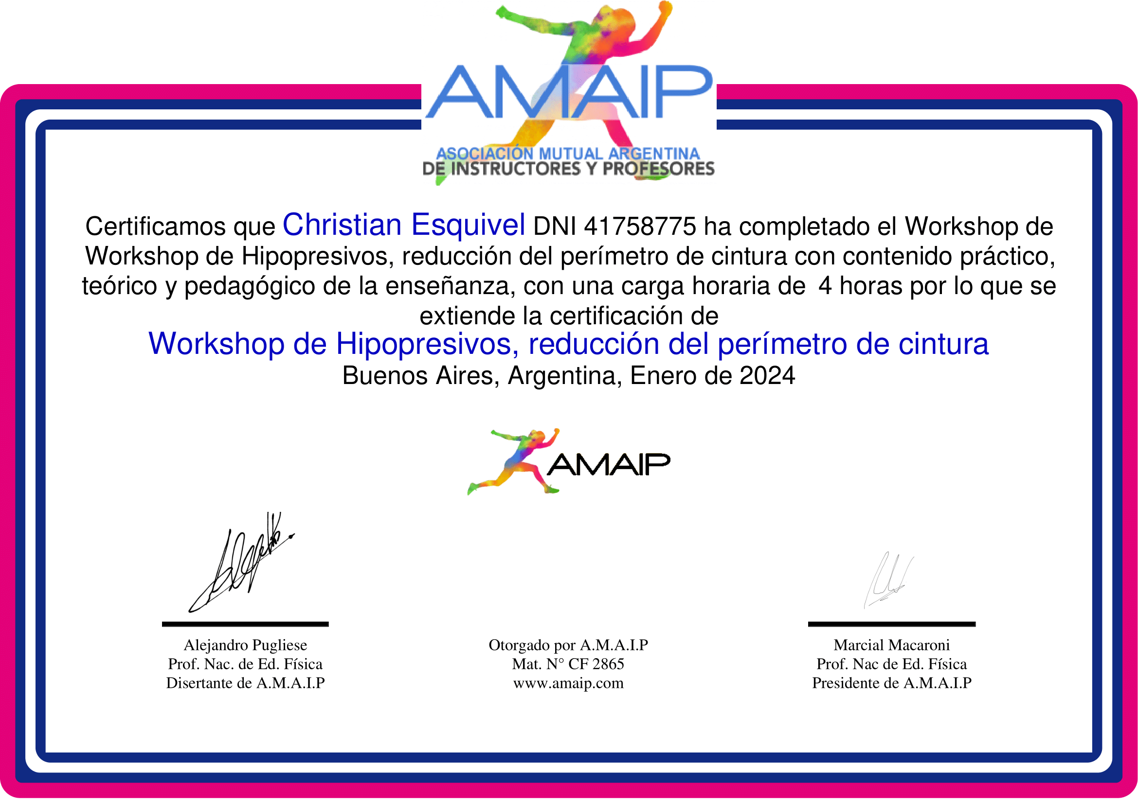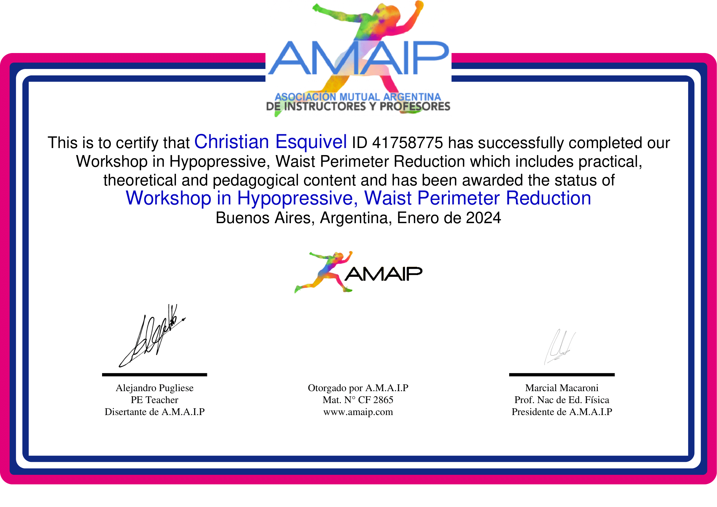 • La formación más avanzada sobre el entrenamiento hipopresivo. • En una cursada mega-intensiva de 2hs, de formato 100% práctico, trabajarás sobre todos los beneficos del método: en la salud, la reeducación postural, la estética, el rendimiento deportivo, y sobre cada una de las técnicas y posturas, con la mayor profundidad de análisis. • IMPORTANTE: los workshops, cuentan con un beneficio exclusivo; obteniendo tu carnet digital del socio AMAIP, podrás inscribirte con un 50% de descuento. • En este sitio verás toda la información del workshop, y el VIDEO explicativo sobre la modalidad de cursada. • Te esperamos en una experiencia única de formación, con cupos limitados. Bienvenidos a AMAIP!