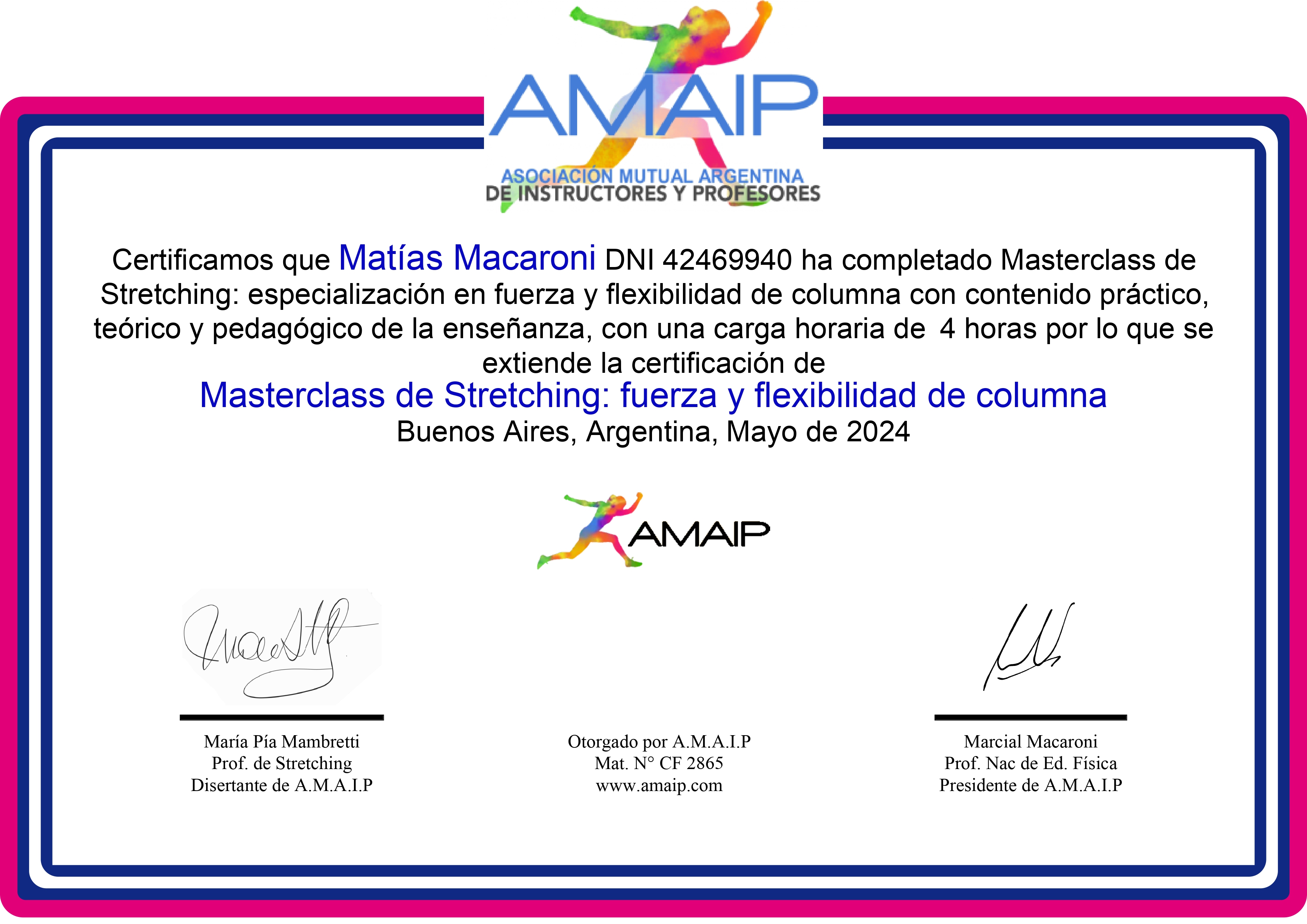 • Una de las claves para alcanzar un gran rendimiento deportivo, sin lesiones, o una excelente calidad de vida, es contar con una COLUMNA SALUDABLE, FUERTE Y FLEXIBLE. En esta masterclass online de 90 minutos, encontrarás cientos de ejercicios específicos de columna vertebral, para trabajar con deportistas, alumnos en un gimnasio, adultos mayores, y en cada nivel de entrenamiento (inicial - intermedio - avanzado). • IMPORTANTE: estas formaciones, cuentan con un beneficio exclusivo: obteniendo tu carnet digital del socio AMAIP, podrás inscribirte con un 50% de DESCUENTO. • Te invitamos a ver toda la información de la masterclass en este sitio, y a formar parte de esta increíble cursada!
