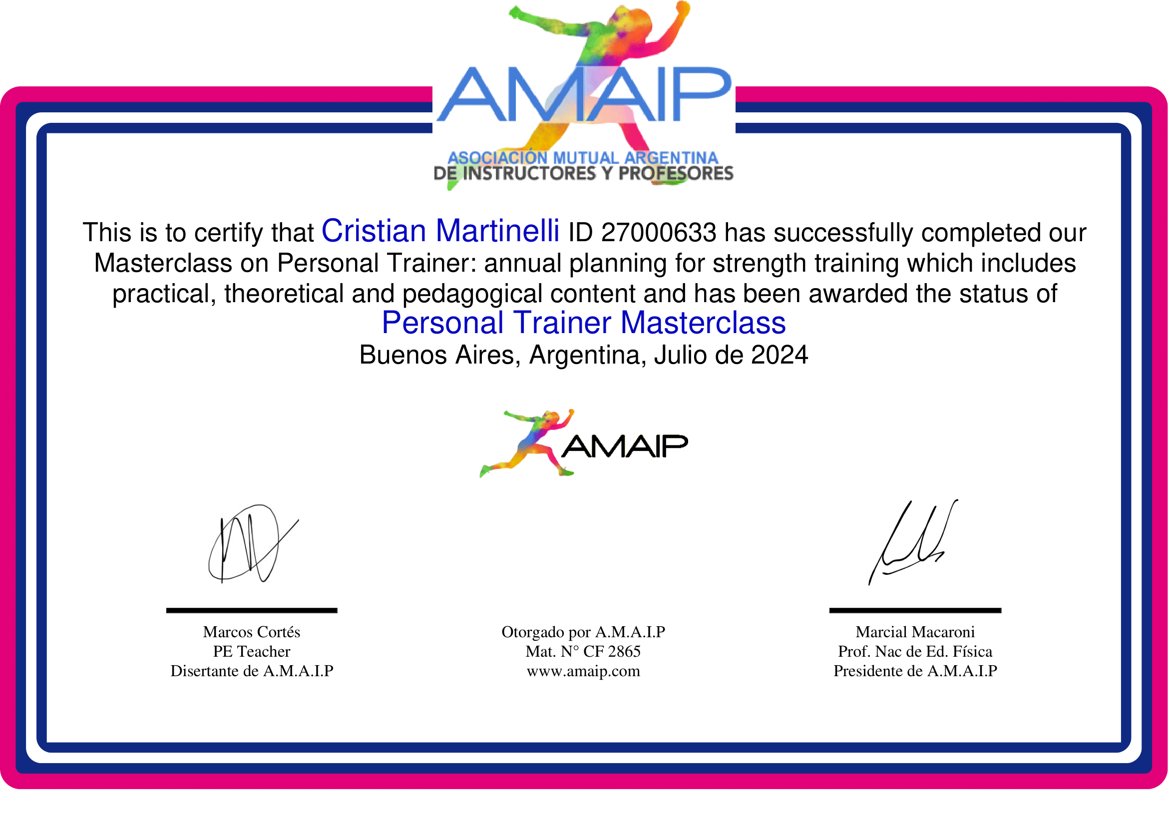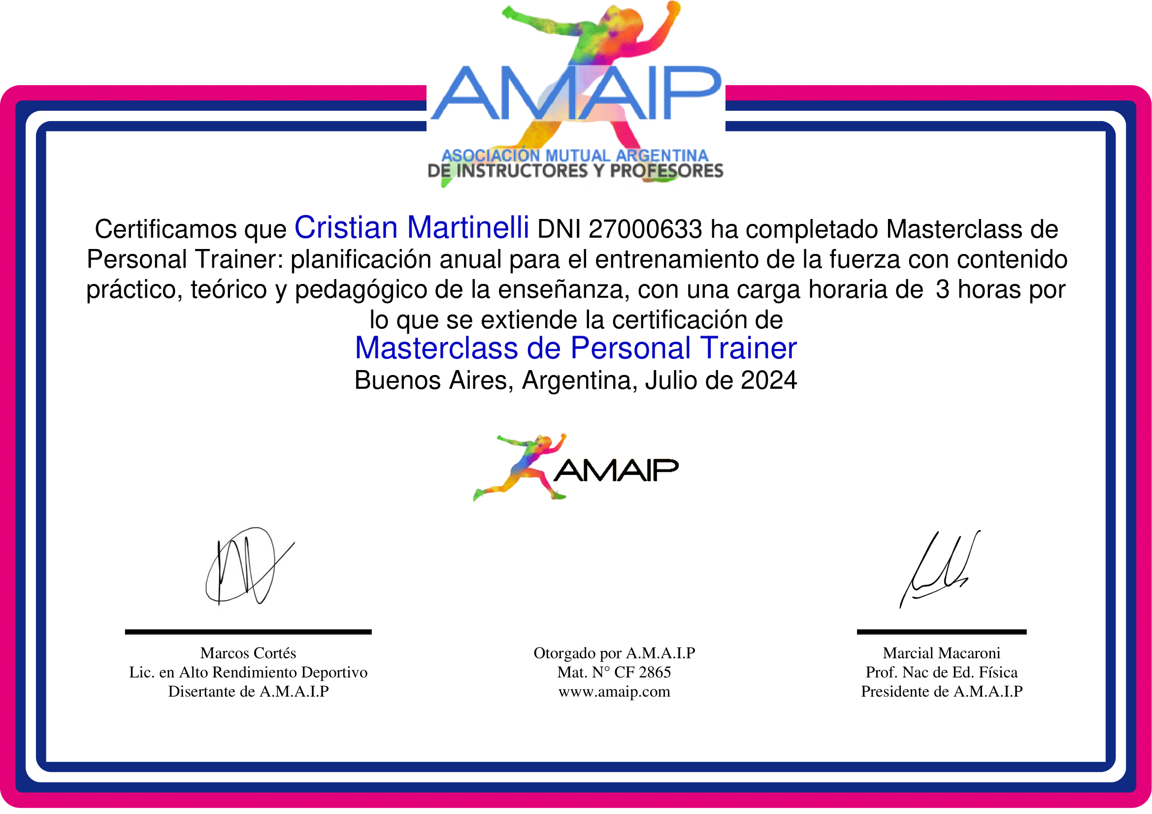• Un interrogante muy común a la hora de ejercer como entrenador personal es: ¿qué debo hacer para comenzar a entrenar a un principiante? En esta masterclass encontrarás la respuesta definitiva. • En 2hs de formación intensiva, verás el recorrido de todo un año de entrenamiento: desde el día 1, cuando llega el alumno con el diagnóstico inicial; pasando por un período de adaptación y técnica sobre los principales ejercicios; variantes de rutinas y progresiones; hasta llegar al mesociclo de fuerza, con plantillas personalizables para que puedas aplicar los contenidos con tus propios alumnos. • IMPORTANTE: estas formaciones, cuentan con un beneficio exclusivo: obteniendo tu carnet digital del socio AMAIP, podrás inscribirte de manera 100% gratuita. • Te invitamos a ver toda la información en este sitio, y a formar parte de esta increíble cursada!