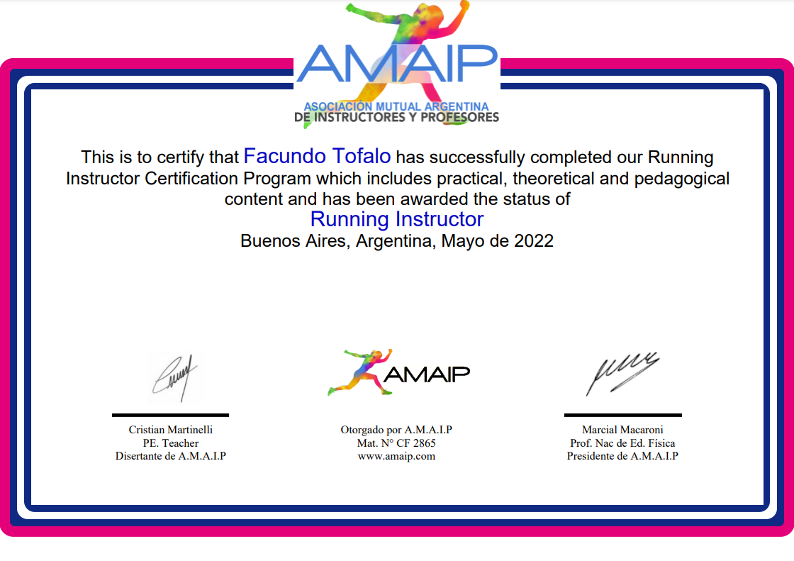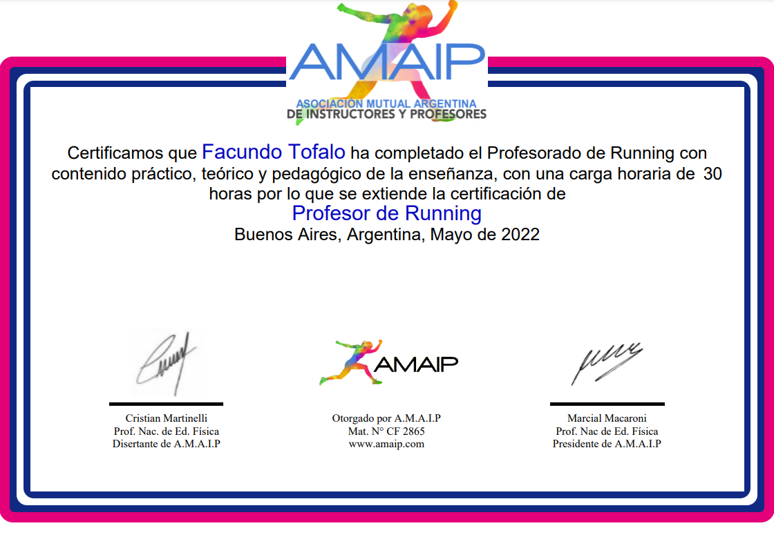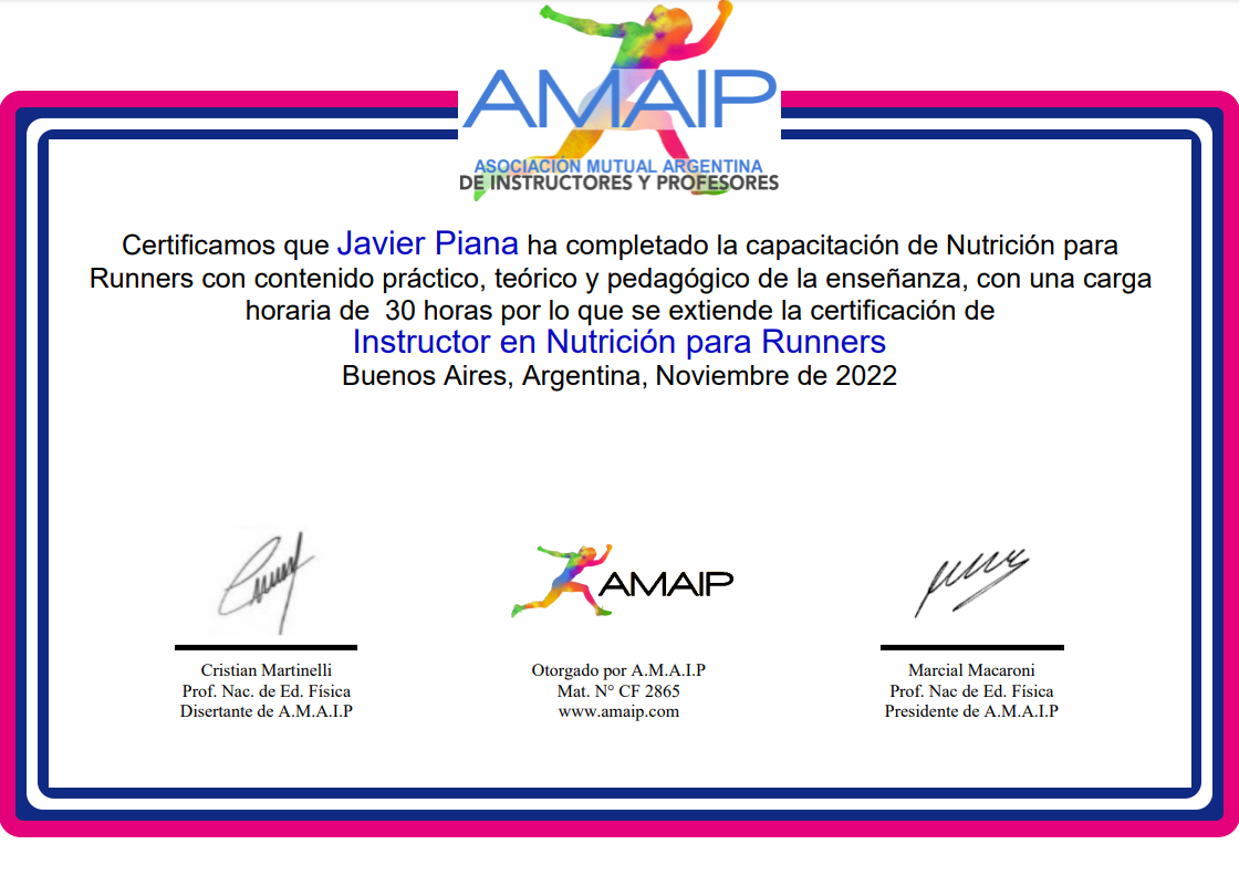• Dos capacitaciones en una. • El profesorado definitivo para la preparación física y técnica de cara a competiciones de 10, 21 y 42 km, y para la organización de grupos Running Team. • Con las herramientas necesarias para diseñar un plan de alimentación integral, con todos los requerimientos alimenticios durante el período de preparación; las semanas previas a la competencia; durante la carrera, y posterior a la misma. • Dictado por el profesor Cristian Martinelli, con más de 15 años al frente de grupos de Running, y como atleta de competición. • Te invito a ver el siguiente VIDEO EXPLICATIVO, donde podrás observar todos los detalles acerca del instructorado, y luego seguir leyendo el temario. • Cualquier consulta estamos a disposición, bienvenidos a AMAIP.
