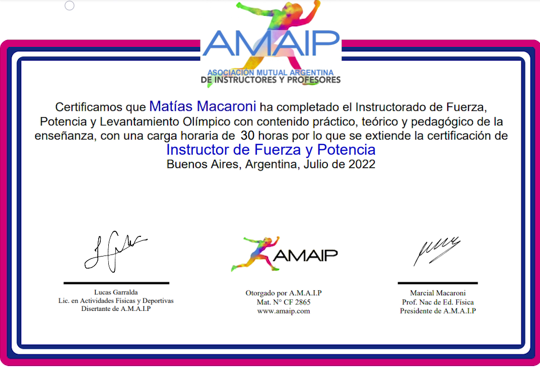 • El instructorado definitivo dedicado al entrenamiento de la fuerza y potencia. 3 meses de formación, donde obtendrás las herramientas para potenciar al máximo el rendimiento deportivo de tus alumnos. • Tanto en los niveles más altos de preparación, como en etapas juveniles y para diferentes objetivos. • En el siguiente VIDEO EXPLICATIVO, verás todos los detalles acerca de los 2 meses de cursada, y luego podrás continuar viendo el TEMARIO, las certificaciones oficiales, junto al asesoramiento de nuestro equipo en todo momento. • ¡Bienvenidos a AMAIP!