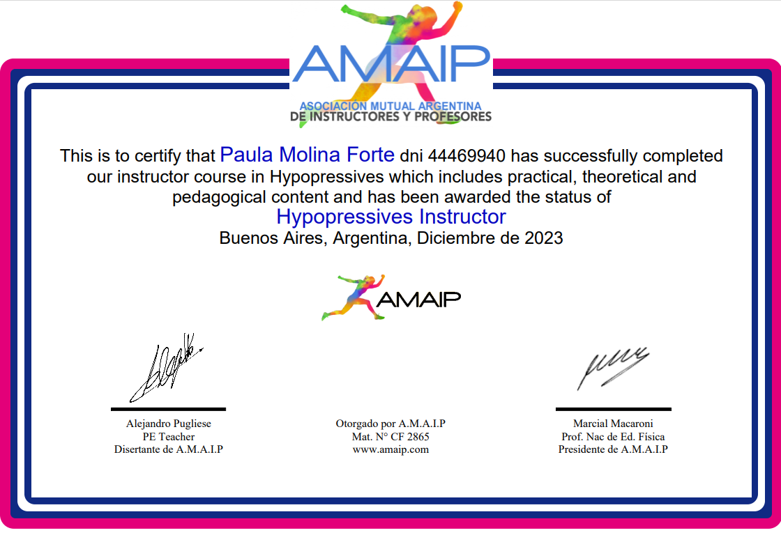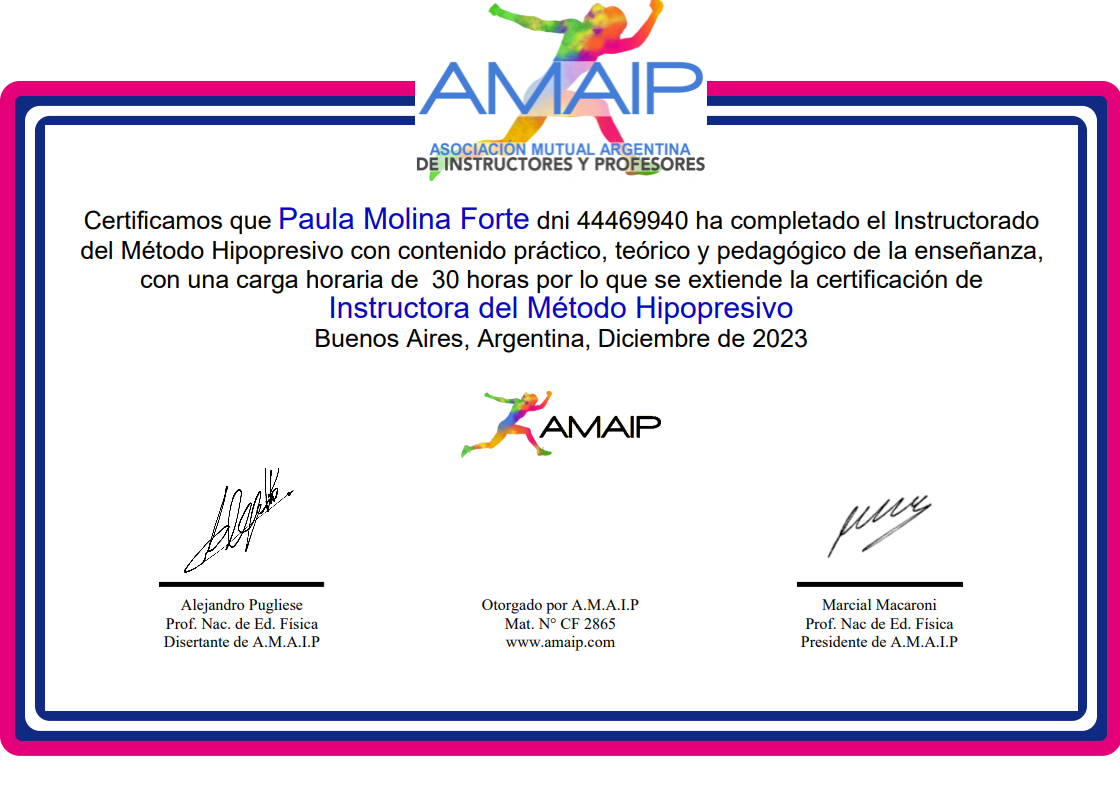 • Te damos la bienvenida a AMAIP Argentina. En esta sección, encontrarás toda la información, del instructorado definitivo sobre el método Hipopresivo. En 8 módulos, y 2 meses de formación, verás las últimas investigaciones sobre el método, sus beneficios para el rendimiento deportivo, la salud, y la reeducación postural; con todos los gestos técnicos y posturas, analizadas desde la anatomía, y la más reciente evidencia científica. • En el siguiente VIDEO EXPLICATIVO, verás todos los detalles acerca de los 2 meses de cursada, y luego podrás continuar viendo el TEMARIO, las certificaciones oficiales, junto al asesoramiento de nuestro equipo en todo momento. • ¡Te esperamos!
